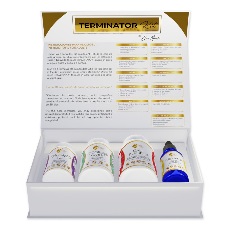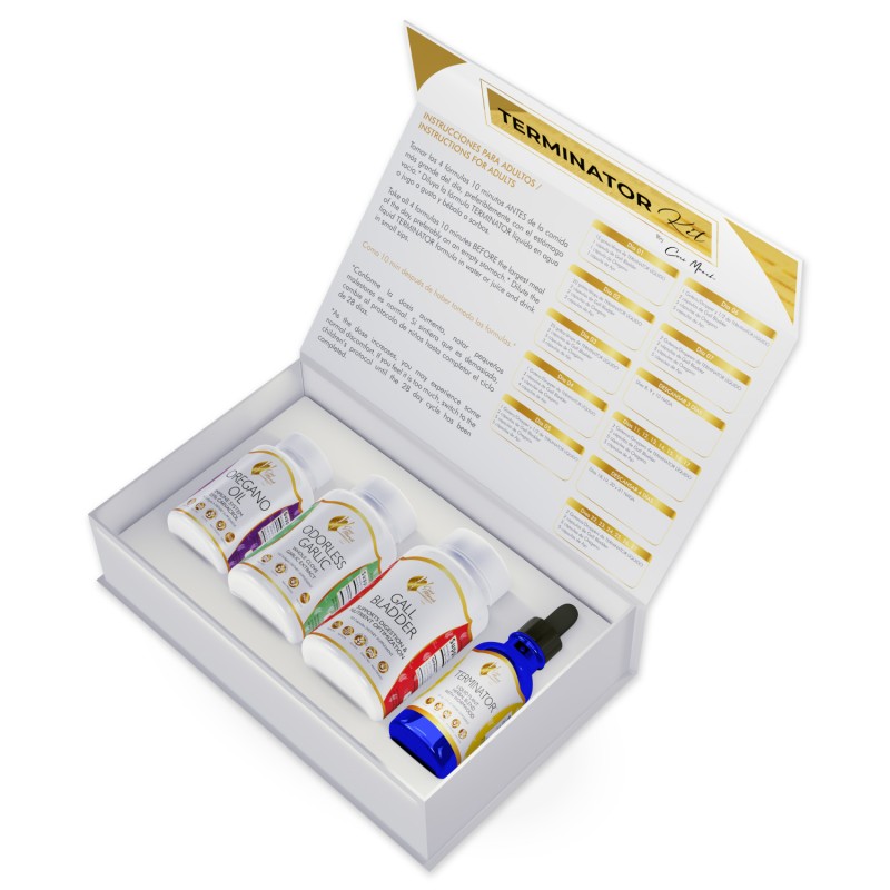 This Kit is composed of four formulas of high concentration and repairing power. Liquid Terminator, Whole Clove Garlic Extract (aged garlic), Oregano with a high concentration of Carvacrol and my exclusive formula for the gallbladder.