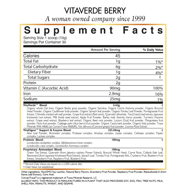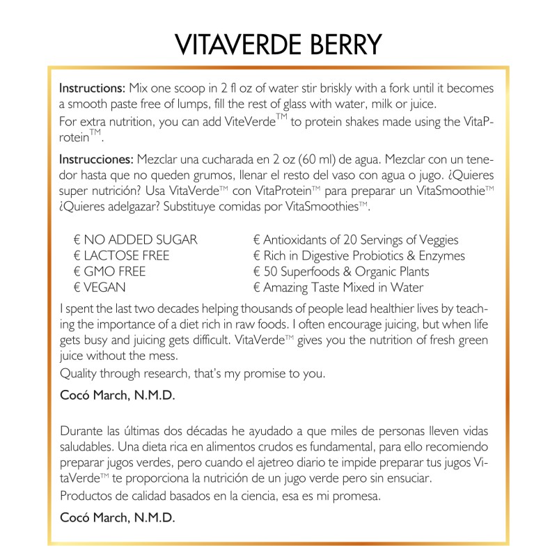 Instructions: Mix one scoop in 2oz. of water stir briskly with a fork until it becomes a smooth paste free of lumps, fill the rest of the glass with water, vegetable milk or juice. For extra nutrition, you can add VitaVerde™ to protein shakes made using the VitaProtein™.