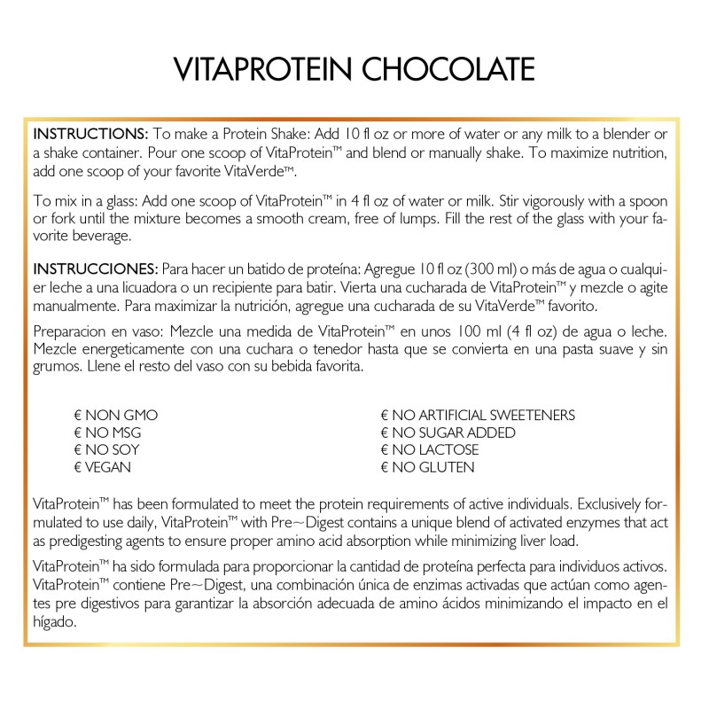 Instructions: To make a protein shake, Add 10 fl oz or more of water or any milk to blender or a shake container. Pour one scoop of VitaProtein™ and blend or manually shake. To maximize nutrition, add more scoop of your favorite VitaVerde™