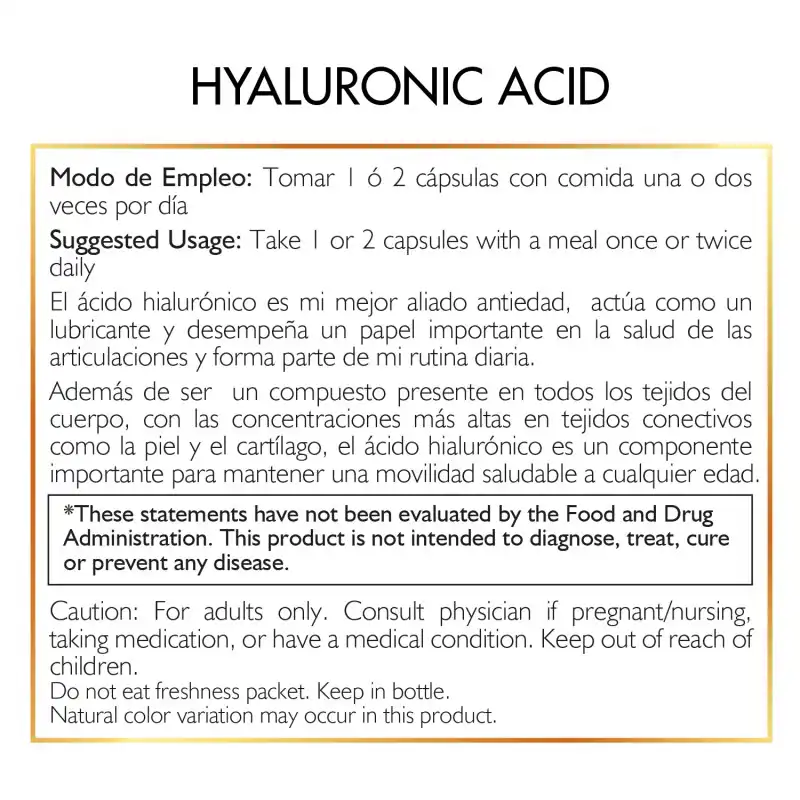 • Apoya la salud articular: El ácido hialurónico es una sustancia que retiene la humedad y mantiene las articulaciones y los tejidos lubricados.