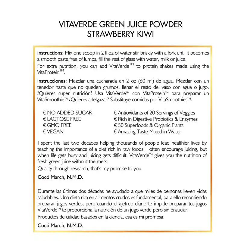 Instrucciones: Mezclar una cucharada en 2oz. de agua. Mezclar con un tenedor hasta que no queden grumos, llenar el resto del vaso con agua, leche o jugo. ¿Quieres supernutrición? Usa VitaVerde™ con VitaProtein™ para preparar un VitaSmoothie™ ¿Quieres adelgazar? Sustituye comidas por VitaSmoothies™