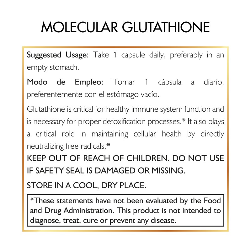 - Absorción mejorada: El Glutatión Molecular está diseñado para garantizar que tu cuerpo no lo descomponga antes de que ocurra la asimilación y absorción adecuadas.